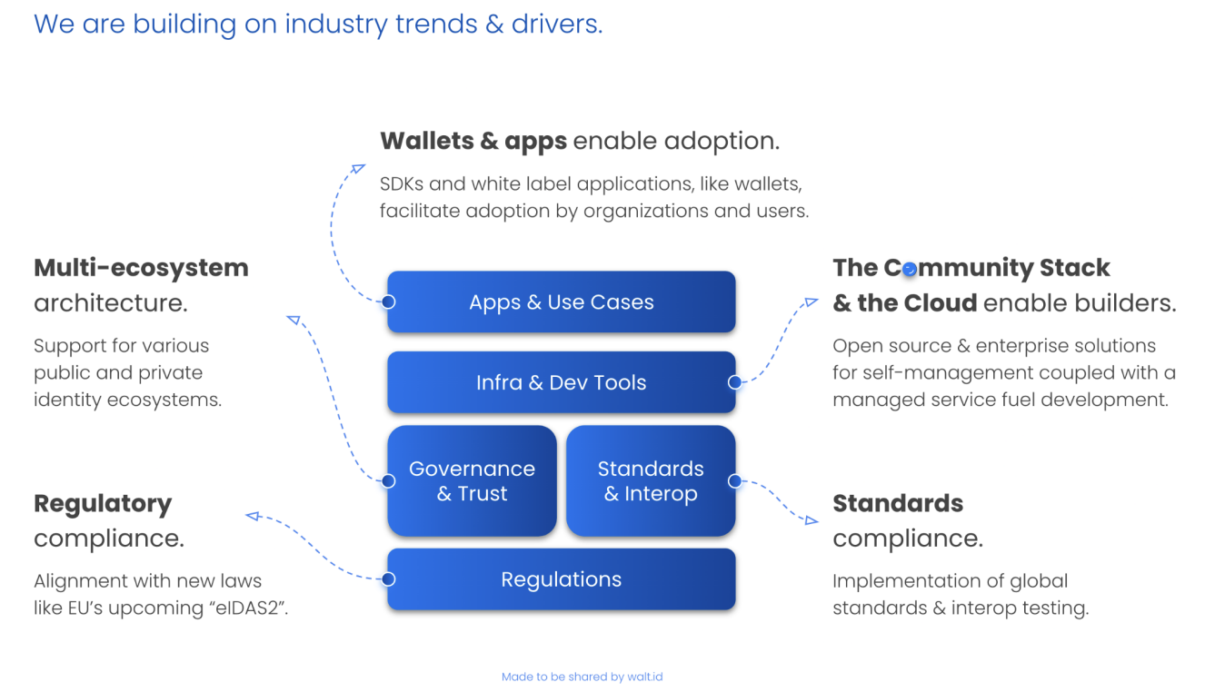 Developers are at the heart of every technological revolution. Creating infrastructure that makes it easier to build applications and use cases unlocks innovation and real world value by spawning new companies and enabling incumbents to leverage decentralized identity. In addition, we foresee identity becoming a commodity, not at least due to the emergence of holistic open source tooling like The Community Stack we’re building at walt.id.